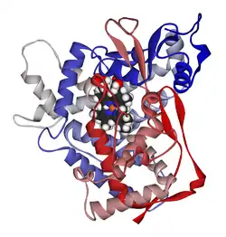 Cytochrome P450 family 2 subfamily C member 9 (abbreviated CYP2C9) is an enzyme protein. The enzyme is involved in metabolism, by oxidation, of both xenobiotics, including drugs, and endogenous compounds, including fatty acids. In humans, the protein is encoded by the CYP2C9 gene.[5][6] The gene is highly polymorphic, which affects the efficiency of the metabolism by the enzyme.[7]