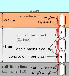 Cable bacteria are filamentous bacteria that conduct electricity across distances over 1 cm in sediment and groundwater aquifers.[1][2] Cable bacteria allow for long-distance electron transport, which connects electron donors to electron acceptors, connecting previously separated oxidation and reduction reactions.[3] Cable bacteria couple the reduction of oxygen[2] or nitrate[4] at the sediment's surface to the oxidation of sulfide[2] in the deeper, anoxic, sediment layers.