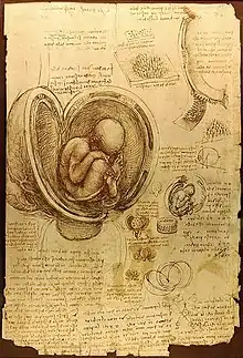 His approach to the depiction of the human body was much like that of the study of architecture, providing multiple views and three-dimensional perspectives of what he witnessed in person. One of the first examples of this is using the three dimensional perspectives to draw a skull in 1489.[11] Further study under Verrocchio, some of Leonardo da Vinci's anatomical work was published in his book A Treatise on Painting.[12] A few years later, in 1516, he partnered with professor and anatomist Marcantonio della Torre in Florence, Italy to take his study further. The two began to conduct dissections on human corpses at the Hospital of Santa Maria Nuova and later at hospitals in Milan and Rome. Through his study, da Vinci was perhaps the first to accurately draw the natural position of the human fetus in the womb, via cadaver of a late mother and her unborn child.[13] It is speculated that he conducted approximately 30 dissections total.[14] His work with cadavers allowed him to portray the first drawings of the umbilical cord, uterus, cervix and vagina and ultimately dispute beliefs that the uterus had multiple chambers in the case of multiple births.[13] It is reported that between 1504 and 1507, he experimented with the brain of an ox by injecting a tube into the ventricular cavities, injecting hot wax, and scraping off the brain leaving a cast of the ventricles. Da Vinci's efforts proved to be very helpful in the study of the brains ventricular system.[15] Da Vinci gained an understanding of what was happening mechanically under the skin to better portray the body through art.[14] For example, he removed the facial skin of the cadaver to more closely observe and draw the detailed muscles that move the lips to obtain a holistic understanding of that system.[16] He also conducted a thorough study of the foot and ankle that continues to be consistent with current clinical theories and practice.[14] His work with the shoulder also mirrors modern understanding of its movement and functions, utilizing a mechanical description likening it to ropes and pulleys.[14] He also was one of the first to study neuroanatomy and made great advances regarding the understanding of the anatomy of the eye, optic nerves and the spine but unfortunately his later discovered notes were disorganized and difficult to decipher due to his practice of reverse script writing (mirror writing).[17]