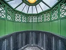 Café Achteck (Octagon Café) is a common local slang for certain public urinals in Berlin. These urinals consist of seven ornamentally decorated, green-painted cast iron wall segments, arranged onto an octagonal floor plan, provide standing room for seven men, and the eighth side is the entrance. The roof is crowned by an eight-sided ventilation hood. In front of the entrance, there is a privacy screen of at least three segments. The design for these urinals came from the city councillor Carl Theodor Rospatt in 1878. In 1920 there were about 142 of these urinals in Greater Berlin, and today about a dozen preserved specimens can be found.