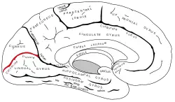 ![]() Medial surface of left cerebral hemisphere. ("Calcarine fissure" visible at left.) | |