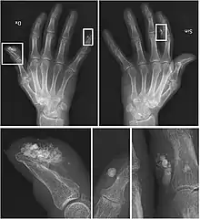 Raynaud's phenomenon is frequently the first manifestation of CREST/lcSSc, preceding other symptoms by years. Stress and cold temperature induce an exaggerated vasoconstriction of the small arteries, arterioles, and thermoregulatory vessels of the skin of the digits. Clinically this manifests as a white-blue-red transition in skin color. Underlying this transition is pallor and cyanosis of the digits, followed by a reactive hyperemia as they rewarm.[3] When extreme and frequent, this phenomenon can lead to digital ulcerations, gangrene, or amputation. Ulceration can predispose to chronic infections of the involved site.