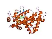 The vitamin D receptor (VDR also known as the calcitriol receptor) is a member of the nuclear receptor family of transcription factors.[5] Calcitriol (the active form of vitamin D, 1,25-(OH)2vitamin D3) binds to VDR, which then forms a heterodimer with the retinoid-X receptor. The VDR heterodimer then enters the nucleus and binds to Vitamin D responsive elements (VDRE) in genomic DNA. VDR binding results in expression or transrepression of many specific gene products. VDR is also involved in microRNA-directed post transcriptional mechanisms.[6] In humans, the vitamin D receptor is encoded by the VDR gene located on chromosome 12q13.11.[7]