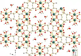 Calcium citrate is sparingly soluble in water. Needle-shaped crystals of tricalcium dicitrate tetrahydrate [Ca3(C6H5O7)2(H2O)2]·2H2O were obtained by hydrothermal synthesis. The crystal structure comprises a three-dimensional network in which eightfold coordinated Ca2+ cations are linked by citrate anions and hydrogen bonds between two non-coordinating crystal water molecules and two coordinating water molecules.[1]
