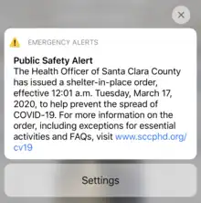 On March 15, Newsom called for voluntary closure of bars and in-home self-isolation of seniors 65 and older, as well as persons at-risk due to underlying conditions.[26] On March 16, the health officers of Alameda, Contra Costa, Marin, San Francisco, San Mateo, and Santa Clara counties announced, with the City of Berkeley, a legal order directing their respective residents to shelter in place for three weeks beginning midnight March 17 to April 7 in order to slow the spread of the coronavirus.[27] The order limited activity, travel and business functions to only the most essential needs.[28][29][30] The same day, the county of Santa Cruz issued a similar shelter in place order.[31]