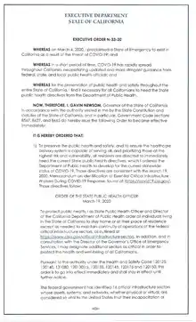 ] - "California Gov. Gavin Newsom announces statewide coronavirus 'stay at home' order | Fox News". www.foxnews.com. Archived from the original on March 21, 2020. Retrieved March 20, 2020.