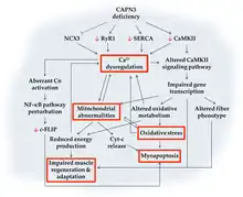 With calpain 3 mutation, proteins typically found at the triad are reduced, including CaMKII (Ca2+/calmodulin-dependent protein kinase II).[4] Decreased CaMKII activity impairs induction of slow oxidative gene expression, which in turn impairs genes involving the mitochondria and lipid metabolism.[4]