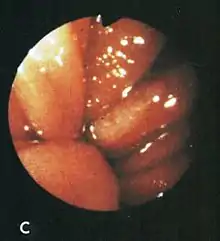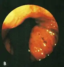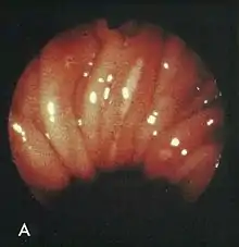 A Cameron lesion is a linear erosion or ulceration of the mucosal folds lining the stomach where it is constricted by the thoracic diaphragm in persons with large hiatal hernias.[1] The lesions may cause chronic blood loss resulting in iron deficiency anemia; less often they cause acute bleeding.