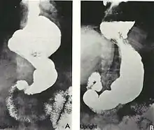 A large hiatal hernia. Two x-rays from the same examination. On lying down (A) more stomach slides above the diaphragm than when upright (B) Note constriction of stomach at diaphragm level.
