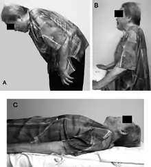 Camptocormia, also known as bent spine syndrome (BSS), is a symptom of a multitude of diseases that is most commonly seen in the elderly. It is identified by an abnormal thoracolumbar spinal flexion, which is a forward bending of the lower joints of the spine, occurring in a standing position. In order to be classified as BSS, the anterior flexion (the lower back bending) must be of 45 degrees anteriorly. This classification differentiates it from a similar syndrome known as kyphosis.[2] Although camptocormia is a symptom of many diseases, there are two common origins: neurological and muscular. Camptocormia is treated by alleviating the underlying condition causing it through therapeutic measures or lifestyle changes.