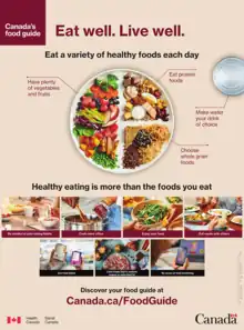 Canada's Food Guide (French: Guide alimentaire canadien) is a nutrition guide produced by Health Canada. In 2007, it was reported to be the second most requested Canadian government publication, behind the Income Tax Forms.[1] The Health Canada website states: "Food guides are basic education tools that are designed to help people follow a healthy diet."