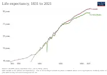 In terms of population health, life expectancy in 2006 was about two and a half years longer in Canada, with Canadians living to an average of 79.9 years and Americans 77.5 years.[122] Infant and child mortality rates are also higher in the U.S.[122] Some comparisons suggest that the American system underperforms Canada's system as well as those of other industrialized nations with universal coverage.[123] For example, a ranking by the World Health Organization of health care system performance among 191 member nations, published in 2000, ranked Canada 30th and the U.S. 37th, and the overall health of Canada 35th to the American 72nd.[10] The WHO did not merely consider health care outcomes, but also placed heavy emphasis on the health disparities between rich and poor, funding for the health care needs of the poor, and the extent to which a country was reaching the potential health care outcomes they believed were possible for that nation. In an international comparison of 21 more specific quality indicators conducted by the Commonwealth Fund International Working Group on Quality Indicators, the results were more divided. One of the indicators was a tie, and in 3 others, data was unavailable from one country or the other. Canada performed better on 11 indicators; such as survival rates for colorectal cancer, childhood leukemia, and kidney and liver transplants. The U.S. performed better on 6 indicators, including survival rates for breast and cervical cancer, and avoidance of childhood diseases such as pertussis and measles. The 21 indicators were distilled from a starting list of 1000. The authors state that, "It is an opportunistic list, rather than a comprehensive list."[124]