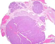 There are often small luminal squamous balls or morules. There is a very well developed supporting tissue that is a loose, fibrillar stroma, rich in hyaluronic acid and chondroitin sulphate.[1] In a few cases small calcifications or microliths may be present. Although seldom necessary, a pathologist can do immunohistochemistry studies to confirm the diagnosis, with the cells strongly reactive with pancytokeratin, S100 protein and SOX10, with a delicate GFAP reaction around the periphery.[5][1][6][7] Even though it is a benign tumor, it must be separated from a basal cell adenoma, pleomorphic adenoma, adenoid cystic carcinoma, and polymorphous adenocarcinoma.