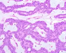 There is a canalicular pattern with cords and ribbons showing connection points between opposing columnar cells within spaces that is called a "string of pearls" appearance.