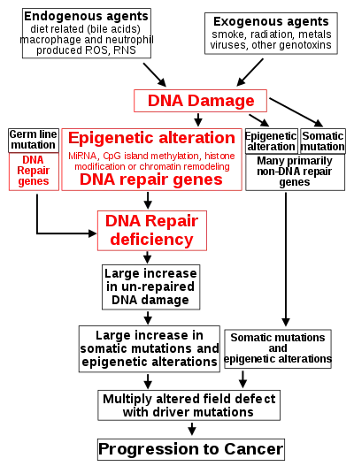 Reduced expression of DNA repair genes disrupts DNA repair. This is shown in the figure at the 4th level from the top. (In the figure, red wording indicates the central role of DNA damage and defects in DNA repair in progression to cancer.) When DNA repair is deficient DNA damage remains in cells at a higher than usual level (5th level) and causes increased frequencies of mutation and/or epimutation (6th level). Mutation rates increase substantially in cells defective in DNA mismatch repair[100][101] or in homologous recombinational repair (HRR).[102] Chromosomal rearrangements and aneuploidy also increase in HRR defective cells.[103]