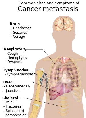 Metastasis is the spread of cancer to other locations in the body. The dispersed tumors are called metastatic tumors, while the original is called the primary tumor. Almost all cancers can metastasize.[36] Most cancer deaths are due to cancer that has metastasized.[37]