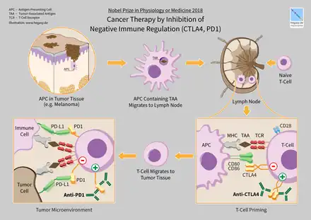 In 2018, American immunologist James P. Allison and Japanese immunologist Tasuku Honjo received the Nobel Prize in Physiology or Medicine for their discovery of cancer therapy by inhibition of negative immune regulation.[2]