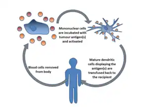 Dendritic cell therapy provokes anti-tumor responses by causing dendritic cells to present tumor antigens to lymphocytes, which activates them, priming them to kill other cells that present the antigen. Dendritic cells are antigen-presenting cells (APCs) in the mammalian immune system.[9] In cancer treatment they aid cancer antigen targeting.[10] The only approved cellular cancer therapy based on dendritic cells is sipuleucel-T.
