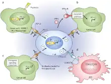- Granier C, De Guillebon E, Blanc C, Roussel H, Badoual C, Colin E, Saldmann A, Gey A, Oudard S, Tartour E (2017). "Mechanisms of action and rationale for the use of checkpoint inhibitors in cancer". ESMO Open. 2 (2): e000213. doi:10.1136/esmoopen-2017-000213. PMC 5518304. PMID 28761757.