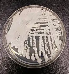 First identified in 2009, Candida auris is a species of ascomycetous fungus of the genus Candida that grows as a yeast.[1] Its name comes from the Latin word for ear, auris.[5] It forms smooth, shiny, whitish-gray, viscous colonies on growth media. Microscopically, cells are ellipsoid in shape.[1]