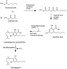 The biosynthesis of cannabigerol begins by loading hexanoyl-CoA onto a polyketide synthase assembly protein and subsequent condensation with three molecules of malonyl-CoA.[8] This polyketide is cyclized to olivetolic acid via olivetolic acid cyclase, and then prenylated with a ten carbon isoprenoid precursor, geranyl pyrophosphate, using an aromatic prenyltransferase enzyme, geranyl-pyrophosphate—olivetolic acid geranyltransferase, to biosynthesize cannabigerolic acid, which can then be decarboxylated to yield cannabigerol.[3][5]