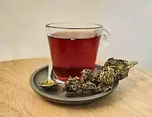 Cannabis tea (also known as weed tea, pot tea, ganja tea or a cannabis decoction) is a cannabis-infused drink prepared by steeping various parts of the cannabis plant in hot or cold water. Cannabis tea is commonly recognized as an alternative form of preparation and consumption of the cannabis plant, more popularly known as marijuana, pot, or weed. This plant has long been recognized as an herbal medicine[1] employed by health professionals worldwide to ease symptoms of disease,[2] as well as a psychoactive drug used recreationally[3] and in spiritual traditions. Though less commonly practiced than popular methods like smoking or consuming edibles, drinking cannabis tea can produce comparable physical and mental therapeutic effects. Such effects are largely attributed to the THC and CBD content of the tea, levels of which are drastically dependent on individual preparation techniques involving volume, amount of cannabis, and boiling time.[4] Also in common with these administration forms of cannabis is the heating component performed before usage. Due to the rather uncommon nature of this particular practice of cannabis consumption in modern times (in contrast to historical use) as well as the legality of cannabis throughout the World, the research available on the composition of cannabis tea is limited and based broadly around what is known of cannabis as it exists botanically.