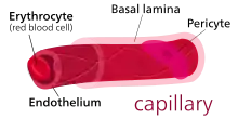 ![]() Transmission electron microscope image of a cross-section of a capillary occupied by a red blood cell | |