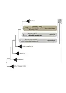 C. owczarzaki is together with Ministeria vibrans a member of the Filasterea clade.[9][1] This group is the sister group to a clade comprising Metazoa and Choanoflagellata, which together form the Filozoa[9][1][10] (See Figure 1). C. owczarzaki was originally described as nucleariids.[7] However, later molecular ribosomal phylogenies placed C. owczarzaki somewhere closer to animals than the rest of nucleariids.[11][12][13] Finally, a multi-gene phylogenetic analysis with several opisthokont taxa clearly showed that C. owczarzaki is not a nucleariid, but part of the Holozoa.[14][15] This was later on corroborated by phylogenomic analyses,[16][17] one of which [17] situated it as sister-group to Ministeria forming the Filasterea clade, which is the sister-group to Choanoflagellatea and Metazoa.[18][19]