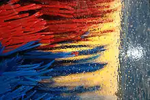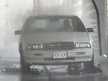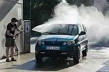 Like soft-touch car washes, touchless car washes are automated, with the vehicle passing through a tunnel where it is cleaned. However, touchless car washes do not use the foam or cloth applicators that soft-touch washes to use, instead relying on high-pressure washers to clean and rinse the vehicle. Sensors utilized by these washes allow for a more precise clean along with the vehicle's exact shape.[14] To compensate for not physically contacting the vehicle, touchless washes use higher pressures and more caustic detergents than ordinary car washes.[15] Because the vehicle is not physically touched during a touchless wash, the vehicle is at a lower risk of being damaged. However, touchless washes have a harder time cleaning off tougher materials or reaching difficult-to-reach locations on vehicles, and their usage of stronger chemicals can potentially damage a vehicle's paint finish.[14][16]