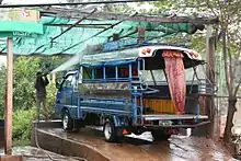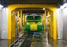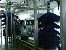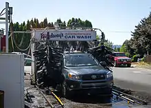 A car wash,[1] or auto wash is a facility used to clean the exterior,[2] and in some cases the interior, of cars. Car washes can be self-service, full-service (with attendants who wash the vehicle), or fully automated (possibly connected to a filling station). Car washes may also be events where people pay to have their cars washed by volunteers, often using less specialized equipment, as a fundraiser.[3]