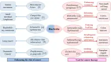 Salmonella Typhi has been linked to gallbladder cancer but may also be useful in delivering chemotherapeutic agents for the treatment of melanoma, colon and bladder cancer.[9] Bacteria found in the gut may be related to colon cancer but may be more complicated due to the role of chemoprotective probiotic cancers.[15] Microorganisms and their metabolic byproducts, or impact of chronic inflammation, may also be linked to oral cancers.[16]