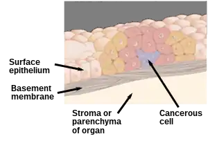 • Invasive carcinoma, usually simply called cancer, has the potential to invade and spread to surrounding tissues and structures, and may eventually be lethal.