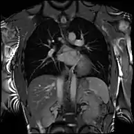 Cardiac magnetic resonance imaging (cardiac MRI, CMR), also known as cardiovascular MRI, is a magnetic resonance imaging (MRI) technology used for non-invasive assessment of the function and structure of the cardiovascular system.[2] Conditions in which it is performed include congenital heart disease, cardiomyopathies and valvular heart disease, diseases of the aorta such as dissection, aneurysm and coarctation, coronary heart disease. It can also be used to look at pulmonary veins.[3]