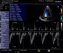 Echocardiography is a non-invasive method of quantifying cardiac output using ultrasound. Two-dimensional (2D) ultrasound and Doppler measurements are used together to calculate cardiac output. 2D measurement of the diameter (d) of the aortic annulus allows calculation of the flow cross-sectional area (CSA), which is then multiplied by the VTI of the Doppler flow profile across the aortic valve to determine the flow volume per beat (stroke volume, SV). The result is then multiplied by the heart rate (HR) to obtain cardiac output. Although used in clinical medicine, it has a wide test-retest variability.[8] It is said to require extensive training and skill, but the exact steps needed to achieve clinically adequate precision have never been disclosed. 2D measurement of the aortic valve diameter is one source of noise; others are beat-to-beat variation in stroke volume and subtle differences in probe position. An alternative that is not necessarily more reproducible is the measurement of the pulmonary valve to calculate right-sided CO. Although it is in wide general use, the technique is time-consuming and is limited by the reproducibility of its component elements. In the manner used in clinical practice, precision of SV and CO is of the order of ±20%.