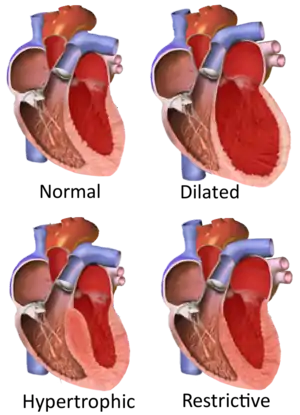 Types of cardiomyopathy include hypertrophic cardiomyopathy, dilated cardiomyopathy, restrictive cardiomyopathy, arrhythmogenic right ventricular dysplasia, and Takotsubo cardiomyopathy (broken heart syndrome).[3] In hypertrophic cardiomyopathy the heart muscle enlarges and thickens.[3] In dilated cardiomyopathy the ventricles enlarge and weaken.[3] In restrictive cardiomyopathy the ventricle stiffens.[3]