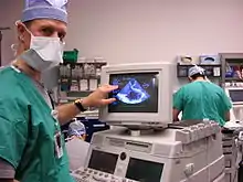 Echocardiography produces a real-time image of the heart via ultrasound imaging, and can be performed in two or three dimensions. There are two ways of performing echocardiography depending on placement of echocardiography probe: transthoracic or transesophageal.