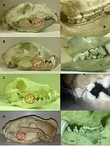 Creodonts have two or three pairs of carnassial teeth, but only one pair performed the cutting function: either M1/m2 or M2/m3, depending on the family.[8] In Oxyaenidae, it is M1 and m2 that form the carnassials. Among the hyaenodontids it is M2 and m3. Unlike most modern carnivorans, in which the carnassials are the sole shearing teeth, in the creodonts other molars have a subordinate shearing function.[9] The fact that the two lineages developed carnassials from different types of teeth has been used as evidence against the validity of Creodonta as a clade.[10][11][12]