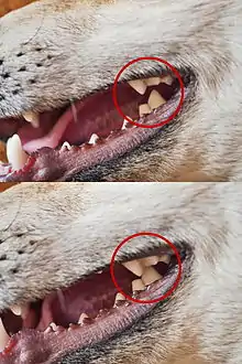 Carnassial teeth infections are common in domestic dogs. They can present as abscesses (a large swollen lump under the eye). Extraction or root canal procedure (with or without a crown) of the tooth is necessary to ensure that no further complications occur, as well as pain medication and antibiotics.[22]