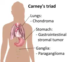 Carney triad (CT), named for J Aidan Carney, is considered to be a specific type of multiple endocrine neoplasia (MEN). The three classically associated tumors are a subset of gastric epithelioid leiomyosarcoma (it is now known that this subset is actually gastrointestinal stromal tumor arising from the interstitial cells of Cajal), pulmonary chondroma, and extra-adrenal paraganglioma.[2]