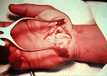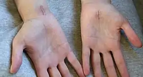 | Untreated carpal tunnel syndrome, showing shrinkage (atrophy) of the muscles at the base of the thumb. | |