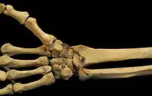 Bones of a human wrist. In this photo both the free position and the saddle shape of the first CMC joint and the proximal transverse palmar arch are clearly visible.