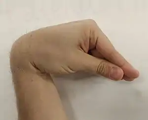 Trousseau sign of latent tetany is a medical sign observed in patients with low calcium.[1] From 1 to 4 percent of normal patients will test positive for Trousseau's sign of latent tetany.[2] This sign may be positive before other manifestations of hypocalcemia such as hyperreflexia and tetany, as such it is generally believed to be more sensitive (94%) than the Chvostek sign (29%) for hypocalcemia.[3][4]