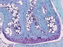 ![]() Light micrograph of undecalcified hyaline cartilage showing chondrocytes and organelles, lacunae and matrix. | |