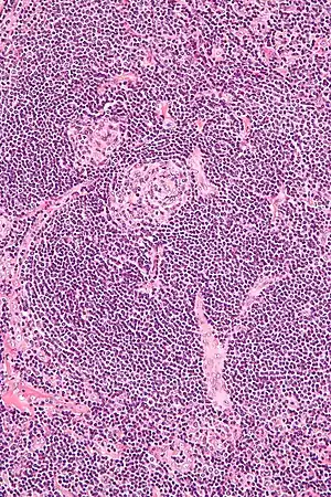 | Micrograph of Castleman disease showing hyaline vascular features including atrophic germinal center, expanded mantle zone, and a radially penetrating sclerotic blood vessel ("lollipop" sign). H&E stain. | |