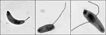 C. crescentus derives its name from its crescent shape, which is caused by the protein crescentin. It is an interesting organism to study because it inhabits nutrient-poor aquatic environments. Their ability to thrive in low levels of nutrients is facilitated by its dimorphic developmental cycle. The swarmer cell has a flagellum that protrudes from a single pole and is unable to initiate DNA replication unless differentiated into a stalked cell. The differentiation process includes a morphological transition characterized by ejection of its flagellum and growth of a stalk at the same pole. Stalked cells can elongate and replicate their DNA while growing a flagellum at the opposite pole, giving rise to a pre-divisional cell. Although the precise function of stalks is still being investigated, it is likely that the stalks are involved in the uptake of nutrients in nutrient-limited conditions.[2] Its use as a model originated with developmental biologist Lucy Shapiro.[3][4]