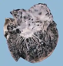 Some substances cause cancer primarily through their physical, rather than chemical, effects on cells.[32] A prominent example of this is prolonged exposure to asbestos, naturally occurring mineral fibers which are a major cause of mesothelioma, which is a cancer of the serous membrane, usually the serous membrane surrounding the lungs.[32] Other substances in this category, including both naturally occurring and synthetic asbestos-like fibers such as wollastonite, attapulgite, glass wool, and rock wool, are believed to have similar effects.[32] Non-fibrous particulate materials that cause cancer include powdered metallic cobalt and nickel, and crystalline silica (quartz, cristobalite, and tridymite).[32] Usually, physical carcinogens must get inside the body (such as through inhaling tiny pieces) and require years of exposure to develop cancer.[32] Common occupational carcinogens include:[33]