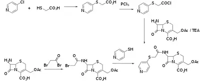 In one of the syntheses, 7-aminocephalosporanic acid (7-ACA) is reacted with bromoacetyl chloride to give the amide. The halo group is then displaced by 4-thiopyridine.[2]