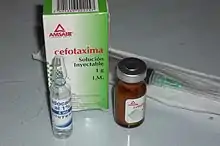 Cefotaxime is an antibiotic used to treat a number of bacterial infections in human, other animals and plant tissue culture.[3] Specifically in humans it is used to treat joint infections, pelvic inflammatory disease, meningitis, pneumonia, urinary tract infections, sepsis, gonorrhea, and cellulitis.[3] It is given either by injection into a vein or muscle.[3]