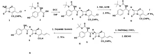 Displacement of the allylic chloride in intermediate (1) with triphenylphosphine gives the phosphonium salt (2). This functionality is then converted to its ylide; condensation with acetaldehyde then leads to the vinyl derivative (3); deprotection then gives cefprozil. Semisynthetic oral cephalosporin consisting of ~90:10 Z/E isomeric mixture.[12][13]