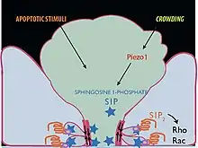 The rate limiting step for all types of cell extrusion discovered thus far is the production of the bioactive lipid, Sphingosine 1-Phosphate[10][11] (S1P), which then binds the G-protein-coupled receptor, S1P2 to trigger Rho-mediated actin and myosin contraction at the base of the cell, propelling the cell out apically. Trafficking of S1P to the basolateral plasma membrane requires microtubules, p115 RhoGEF[12] and the plus-ended microtubule binding tumor suppressor Adenomatous Polyposis Coli (APC).[13] While the S1P-S1P2-Rho-actin/myosin axis apparently controls all extrusions, this axis can be activated by different signaling, depending on the stimulus. Apoptotic extrusion may activate S1P simply through caspase activation.[14] However, live cell extrusion is activated by crowding dependent activation of the stretch-activated cation channel Piezo1.[4] Extrusion triggered by replicative stress[2] or by cell competition[15] requires p53 activation.